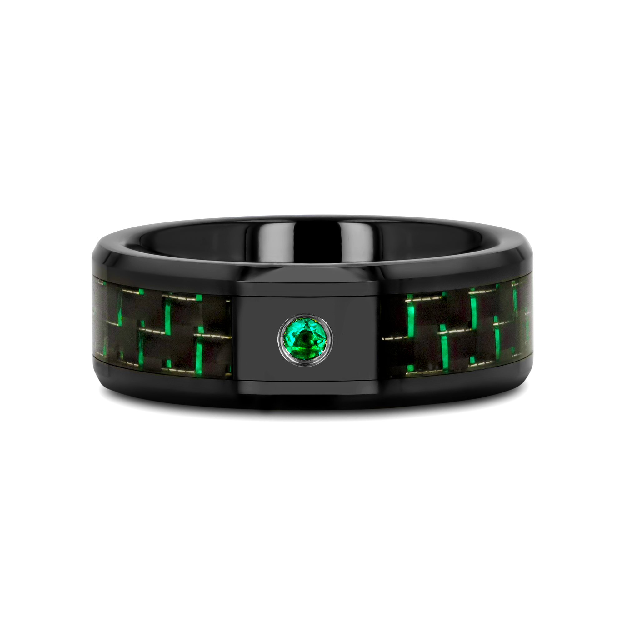 HADAR Black Ceramic Ring with Black and Green Carbon Fiber and Green Emerald Setting - 8mm