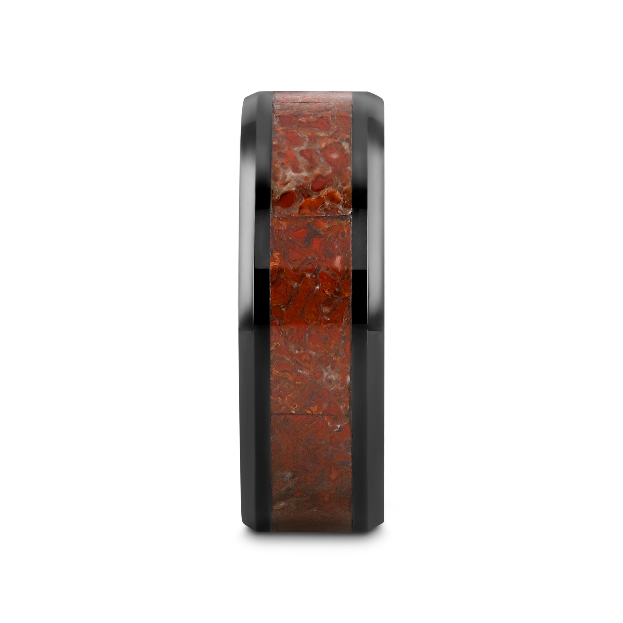 TRIASSIC Red Dinosaur Bone Inlaid Black Ceramic Beveled Edged Ring - 4mm & 8mm