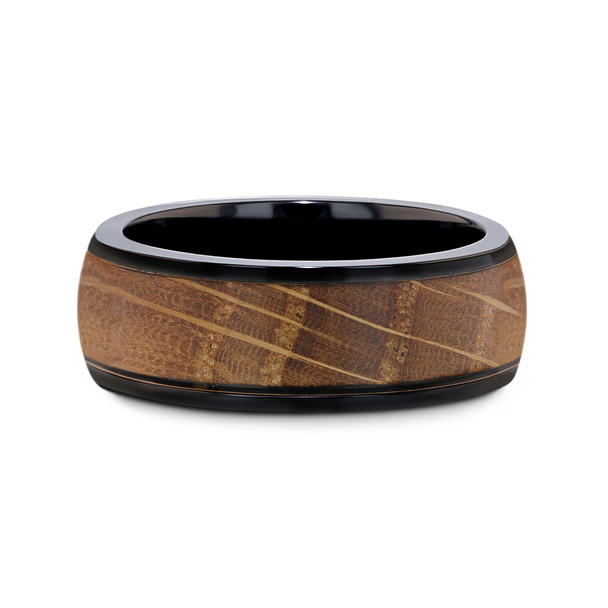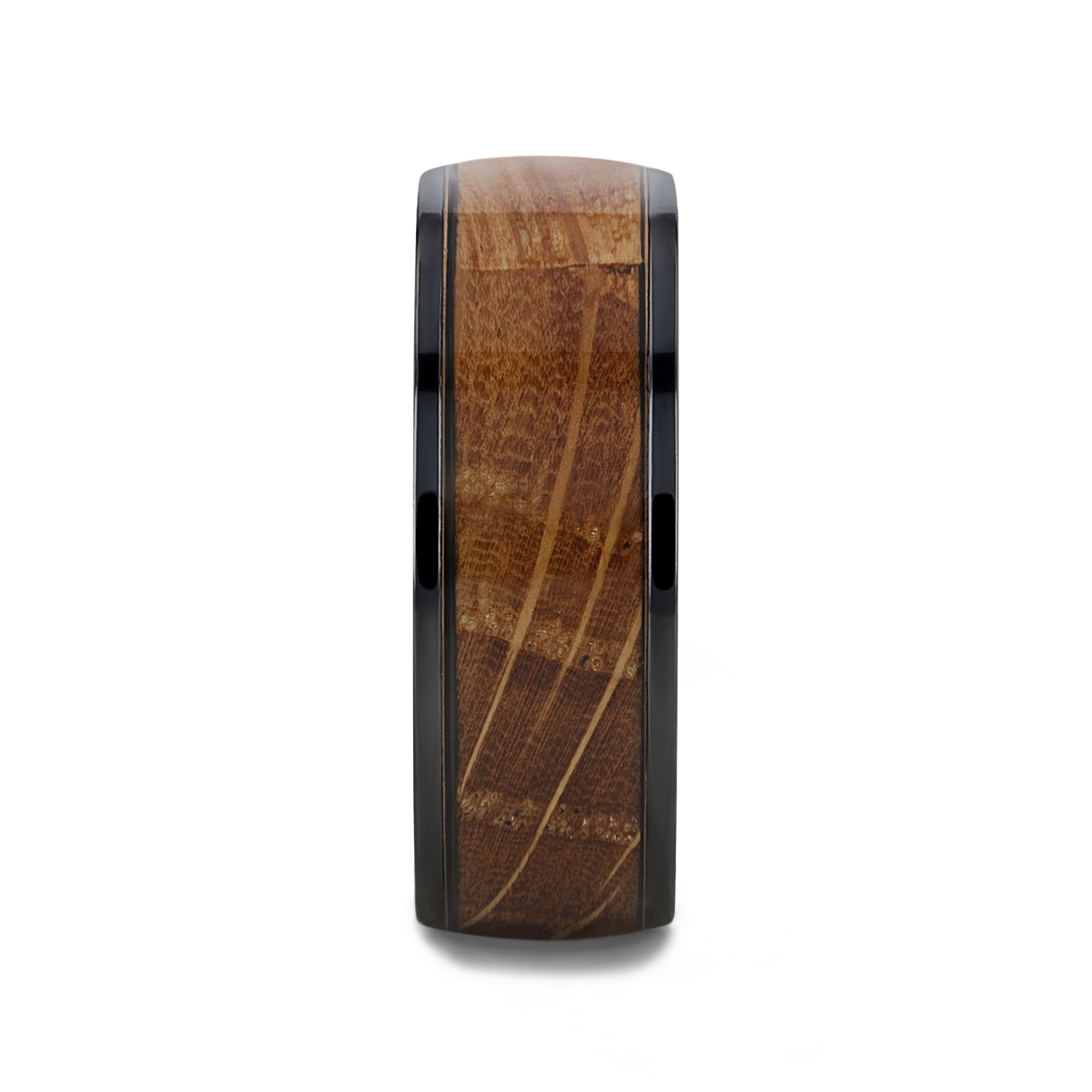 SCOTCH Black Ceramic Ring featuring Whiskey Barrel Wood Inlay. A bold blend of craftsmanship and character in 8mm, for a extraordinary and sophisticated look. Made from whiskey barrels once used by Jack Daniel's Distillery