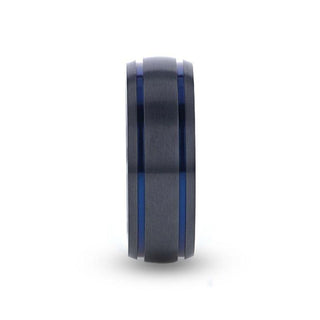 WESTLEY Flat Brushed Finish Black Ceramic Men’s Wedding Ring with Blue Grooved Center - 8mm