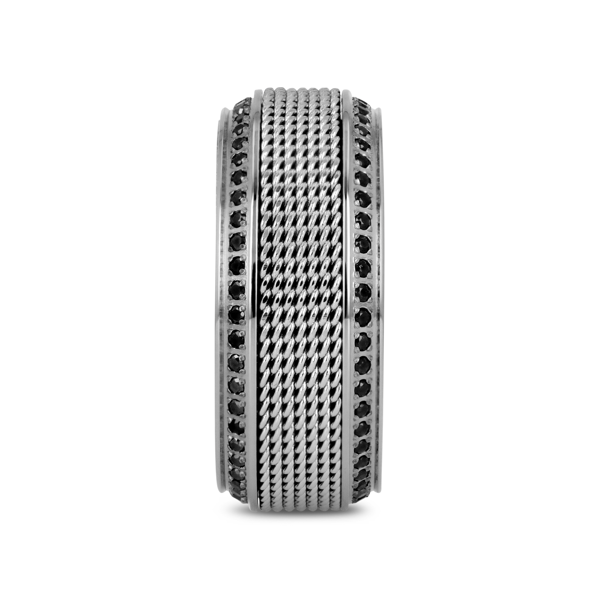 GAUNTLET Steel Chain Titanium Wedding Ring Polished Beveled Edges Set with Round Black Diamonds - 10mm