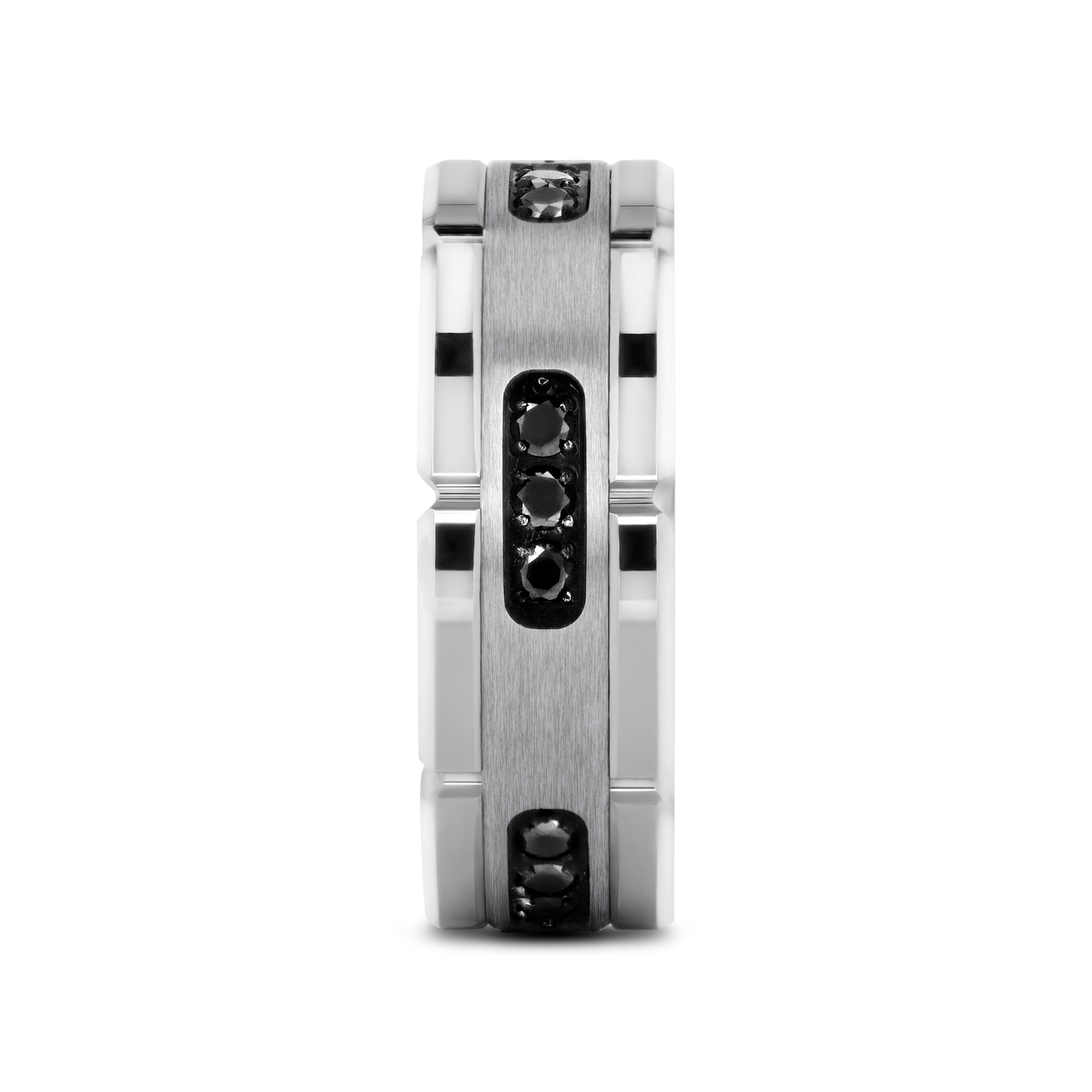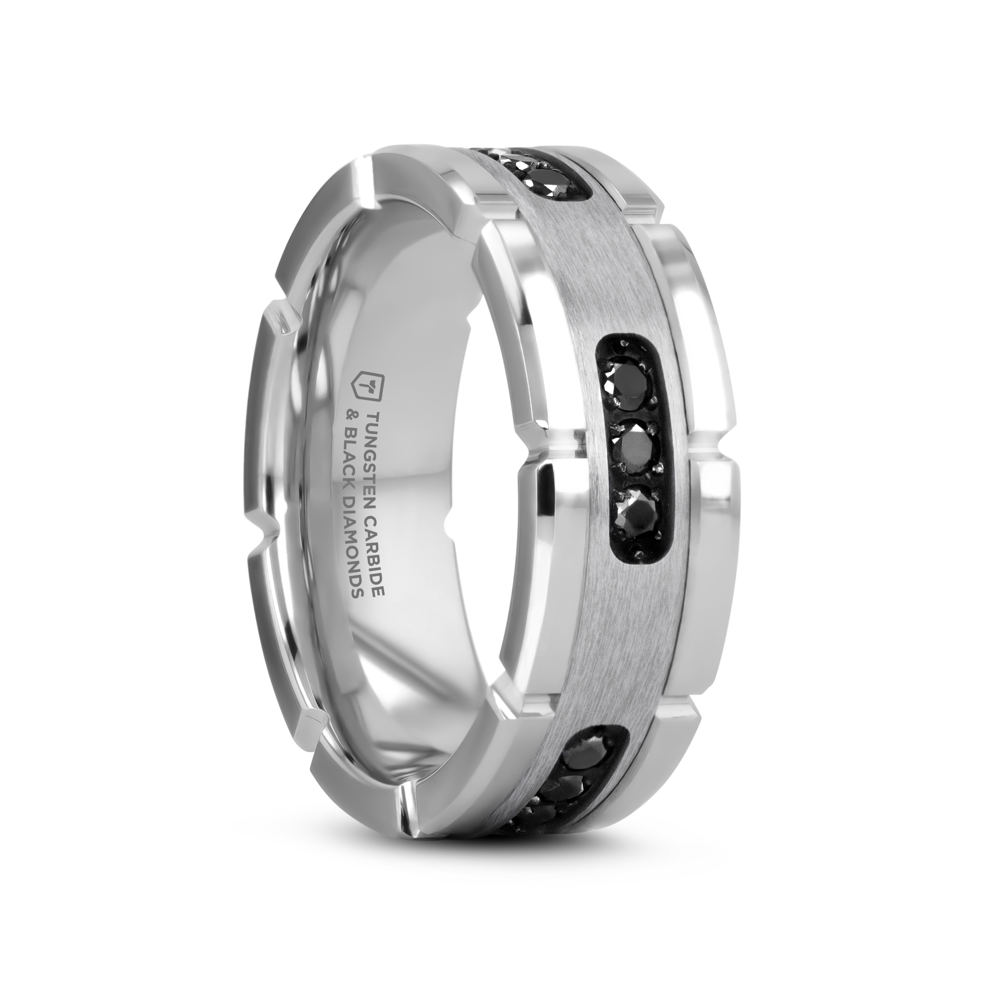This bold Thorsten Tungsten Carbide ring has a grooved band with polished notches a marvelous silver inlay with inset stunning round-cut, black diamonds. The ring’s nine black diamonds encircle the ring halfway in groups of three.