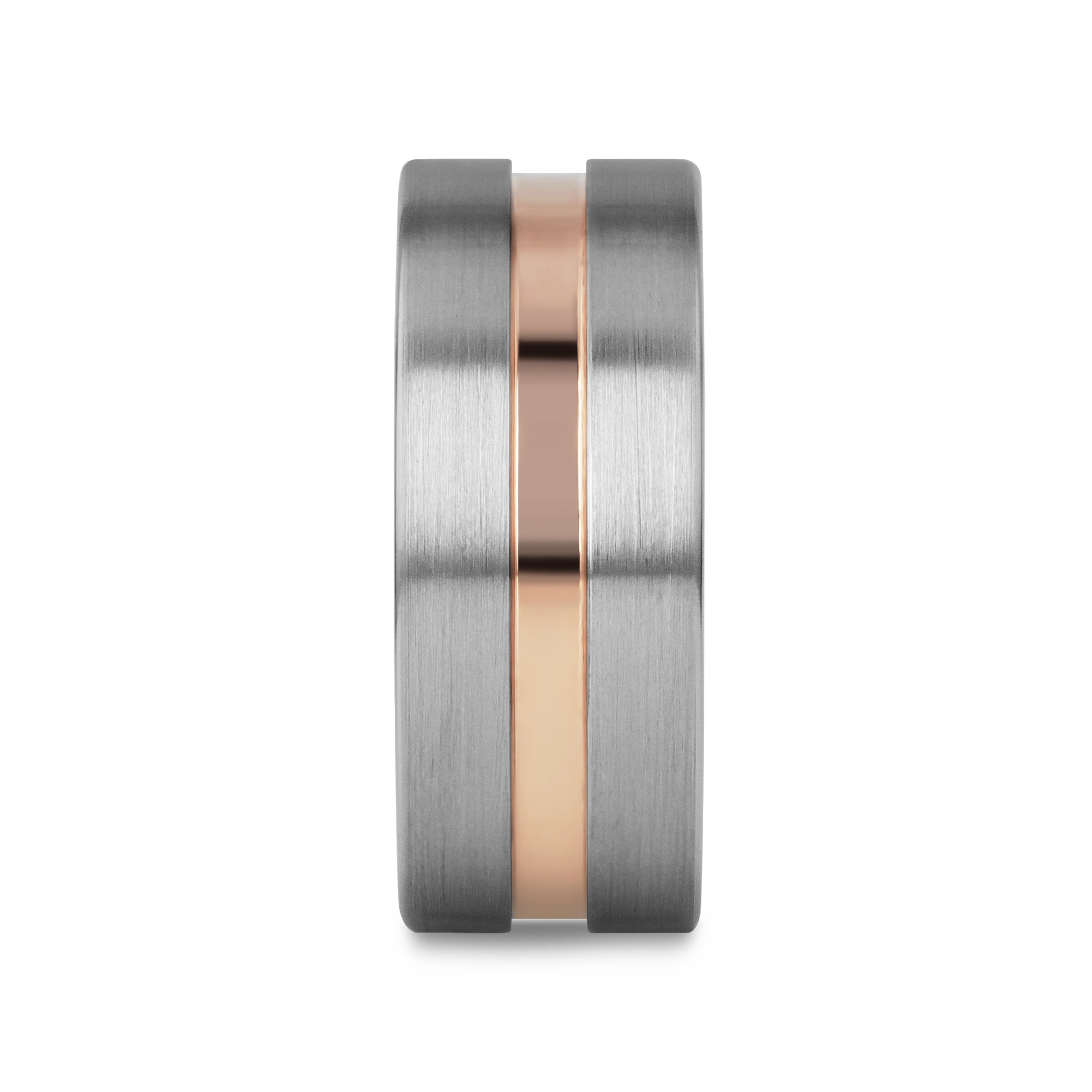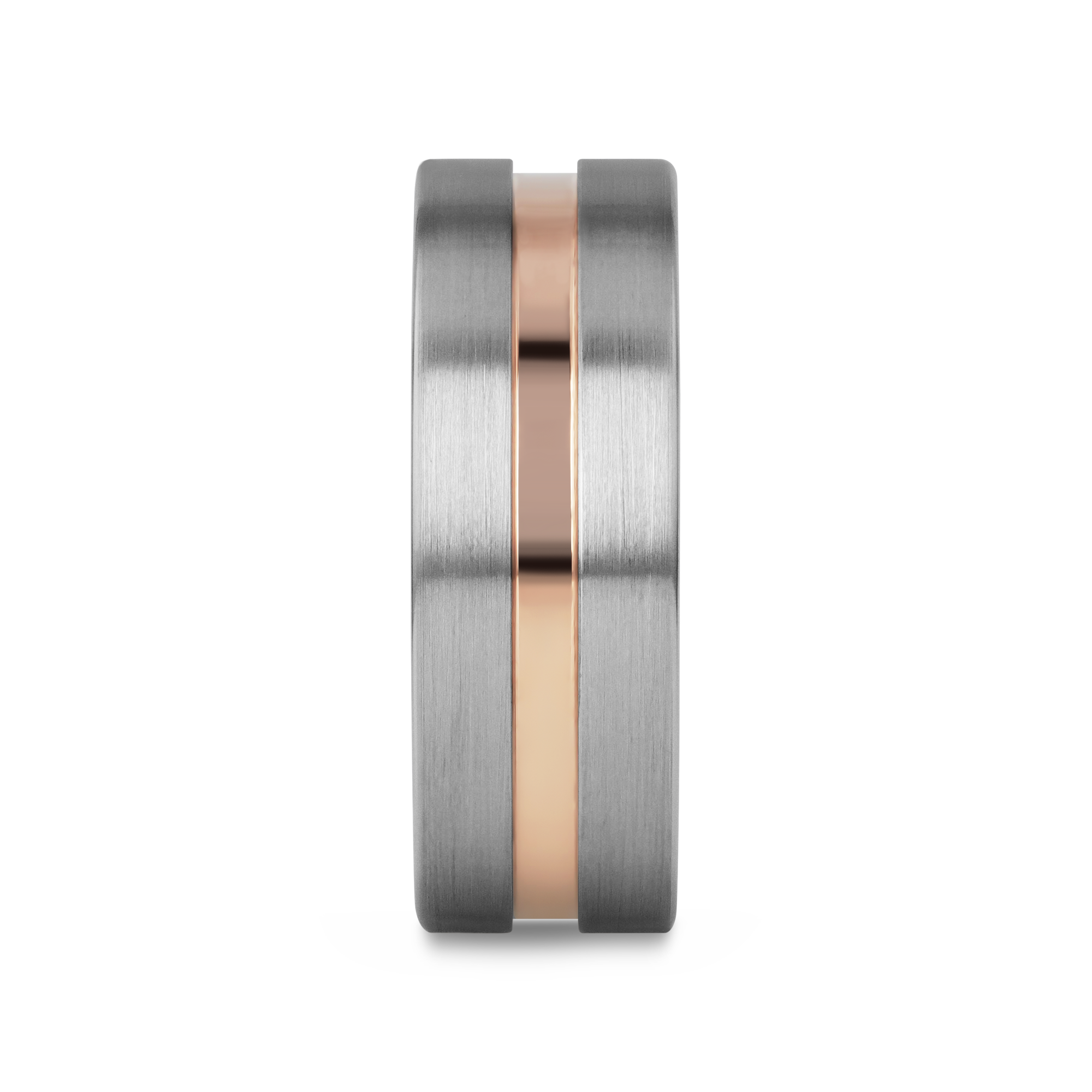This flatprofiled design and fine brush finish of this tastefully elegant Thorsten Tungsten Ring features a touch of added sophistication with its shallow rose goldplated groove. There is no other ring like it on the market.