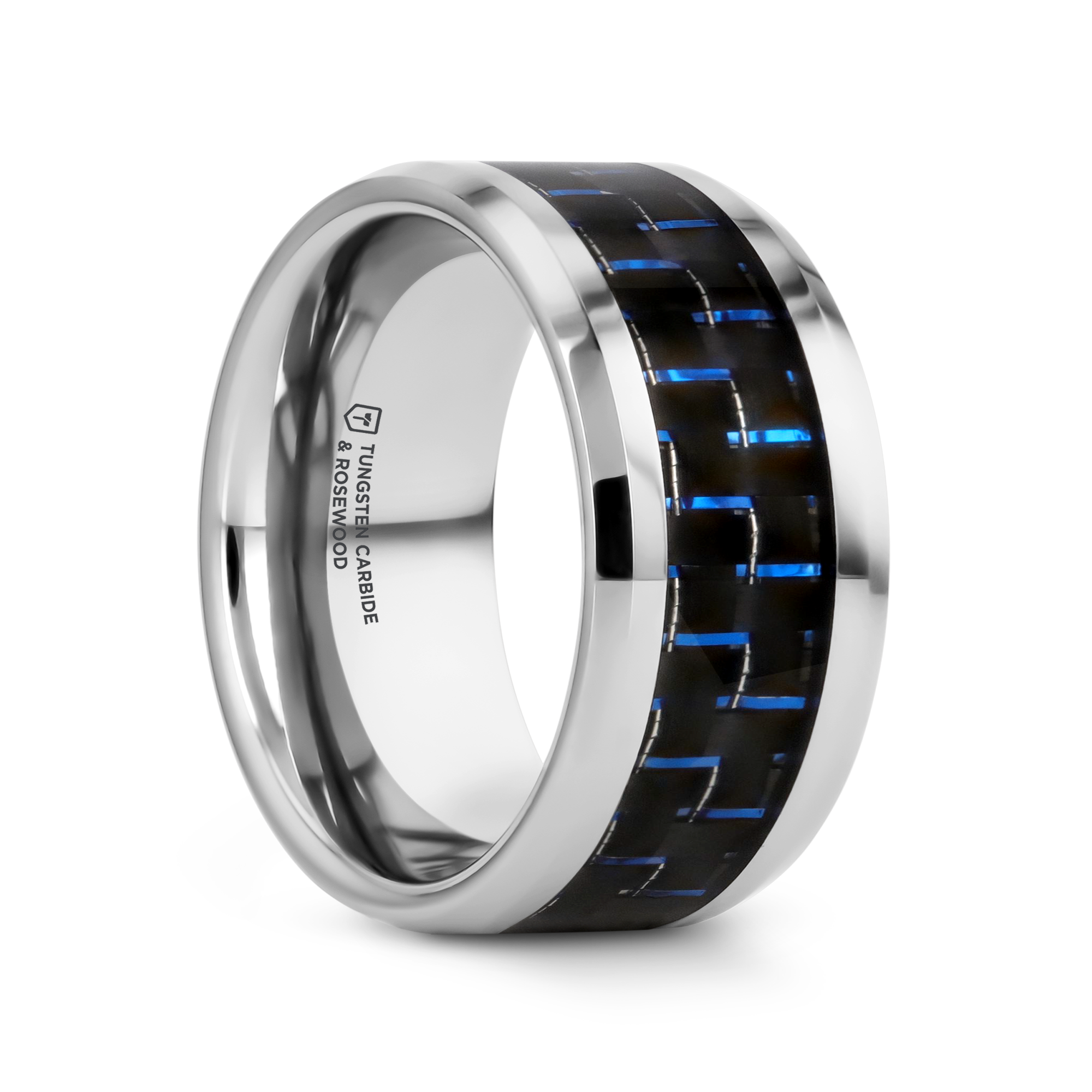 Exotic black and blue carbon fiber is inlaid into this Tungsten Carbide stunning ring design by Thorsten.