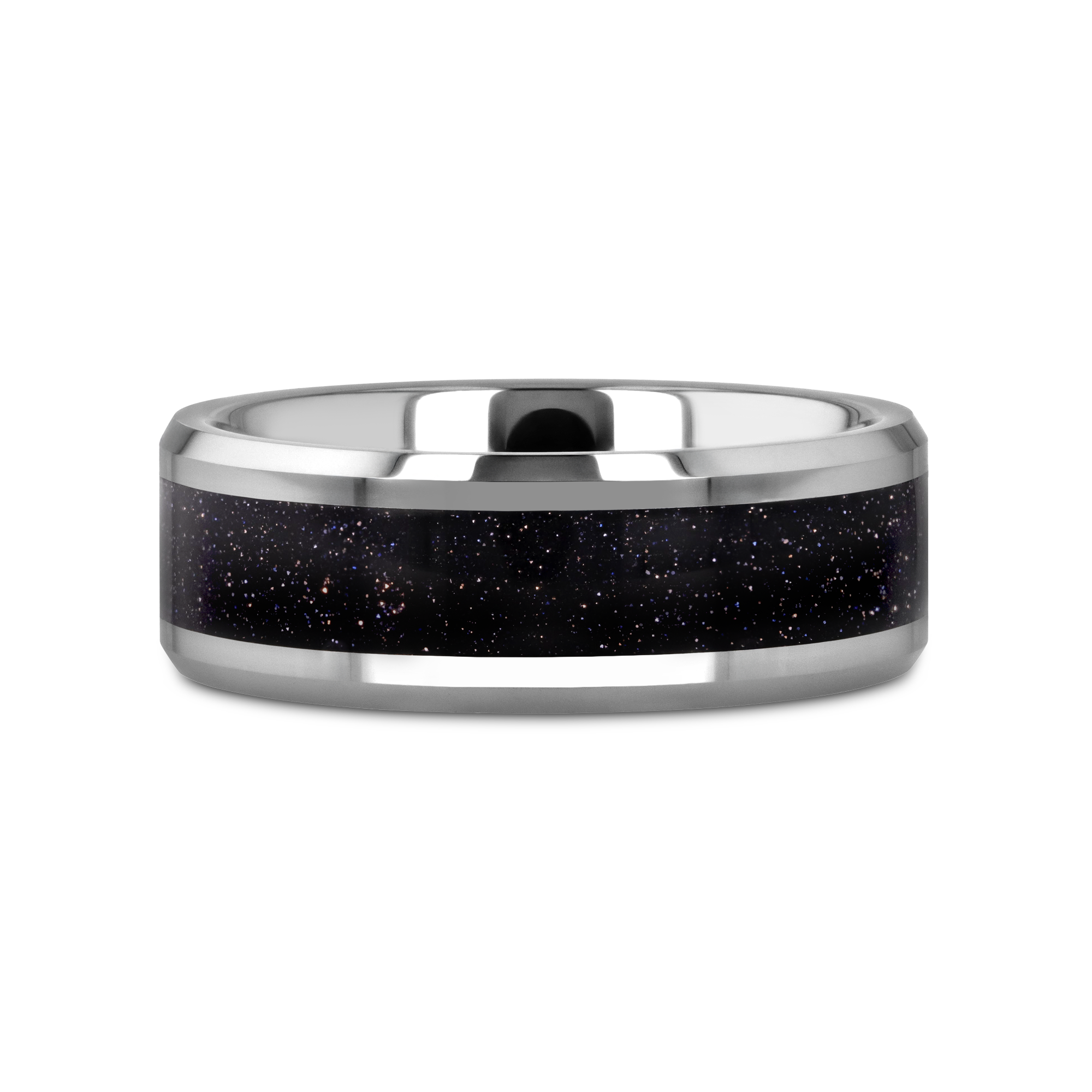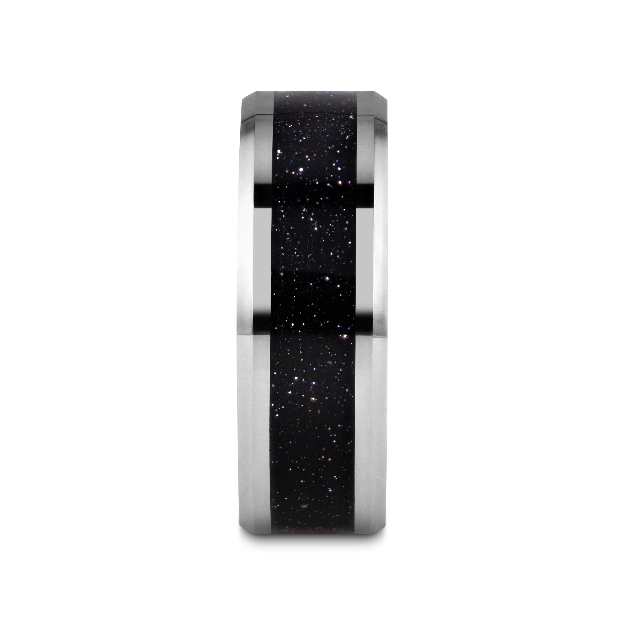 This beautiful bevel-edged Tungsten Carbide wedding band design by Thorsten features a glistening Synthetic Purple Goldstone inlay, a man-made glass gem that’s filled with metallic copper and often considered as a protection stone that repels negative energy.