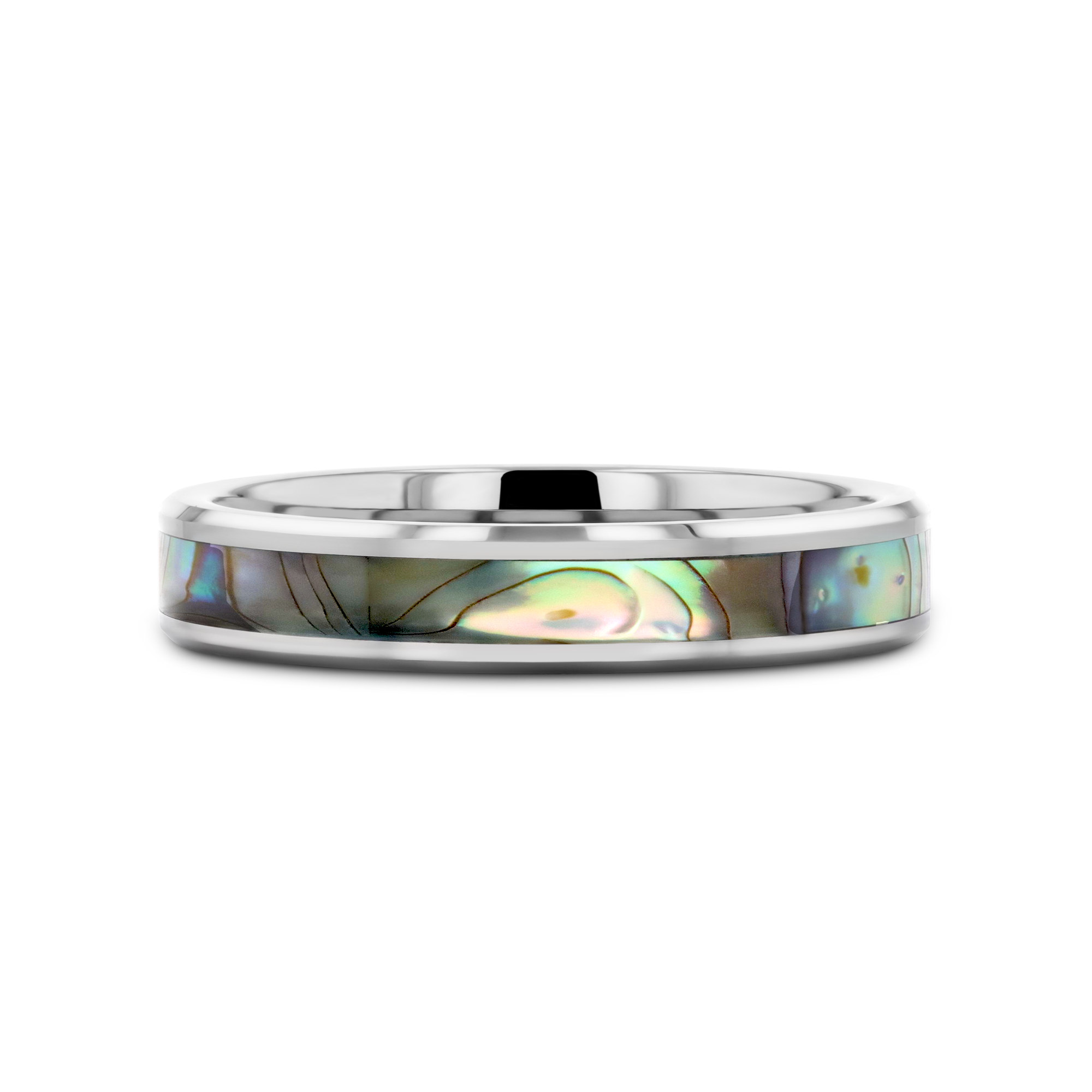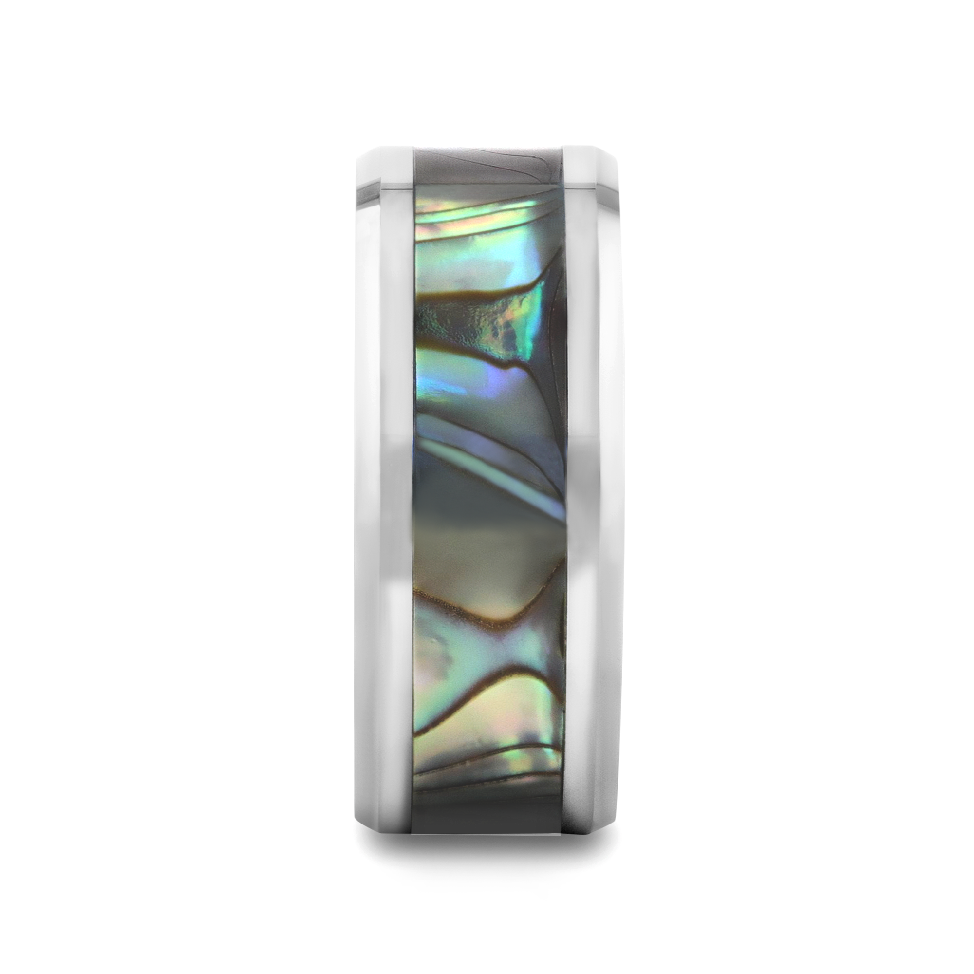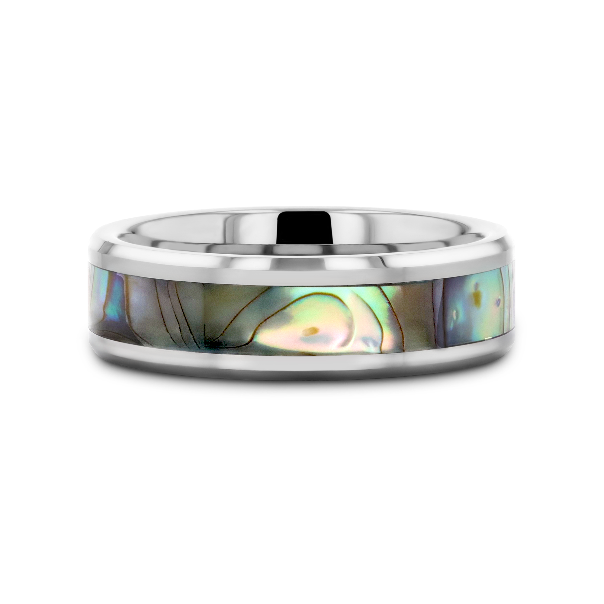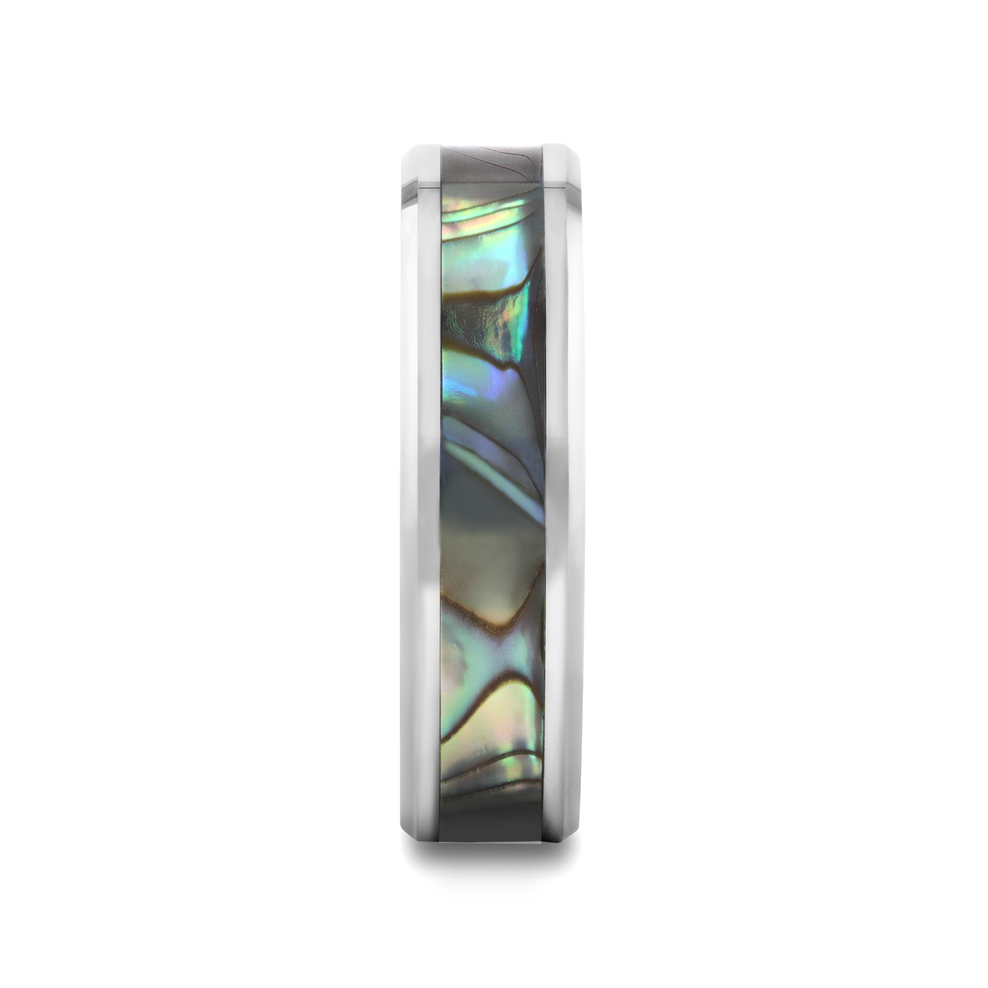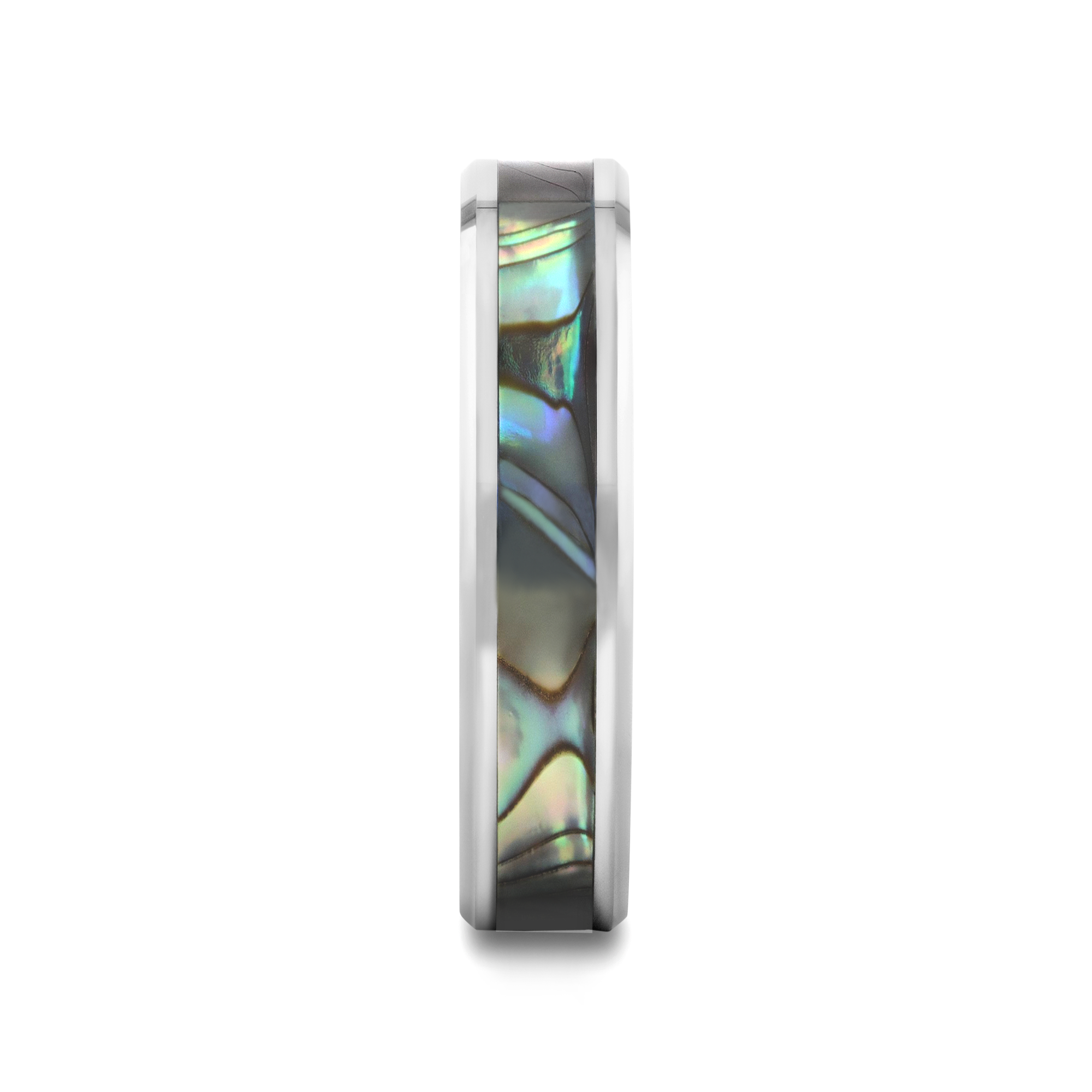 This beautiful Tungsten Carbide ring by Thorsten has polished beveled edges and a Mother-of-Pearl inlay displaying iridescent purple, blue, green, white, and black swirls like the shimmering waves in the ocean. Made from the inside lining of oyster and abalone shells, Mother-of-Pearl is a decorative material that has been used for centuries for furniture, musical instruments, and jewelry.