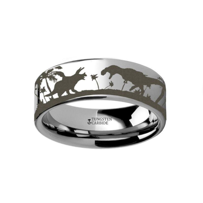 Prehistoric Dinosaur Jurassic Themed Portrait Ring Engraved Flat Tungsten Ring - 4mm - 12mm