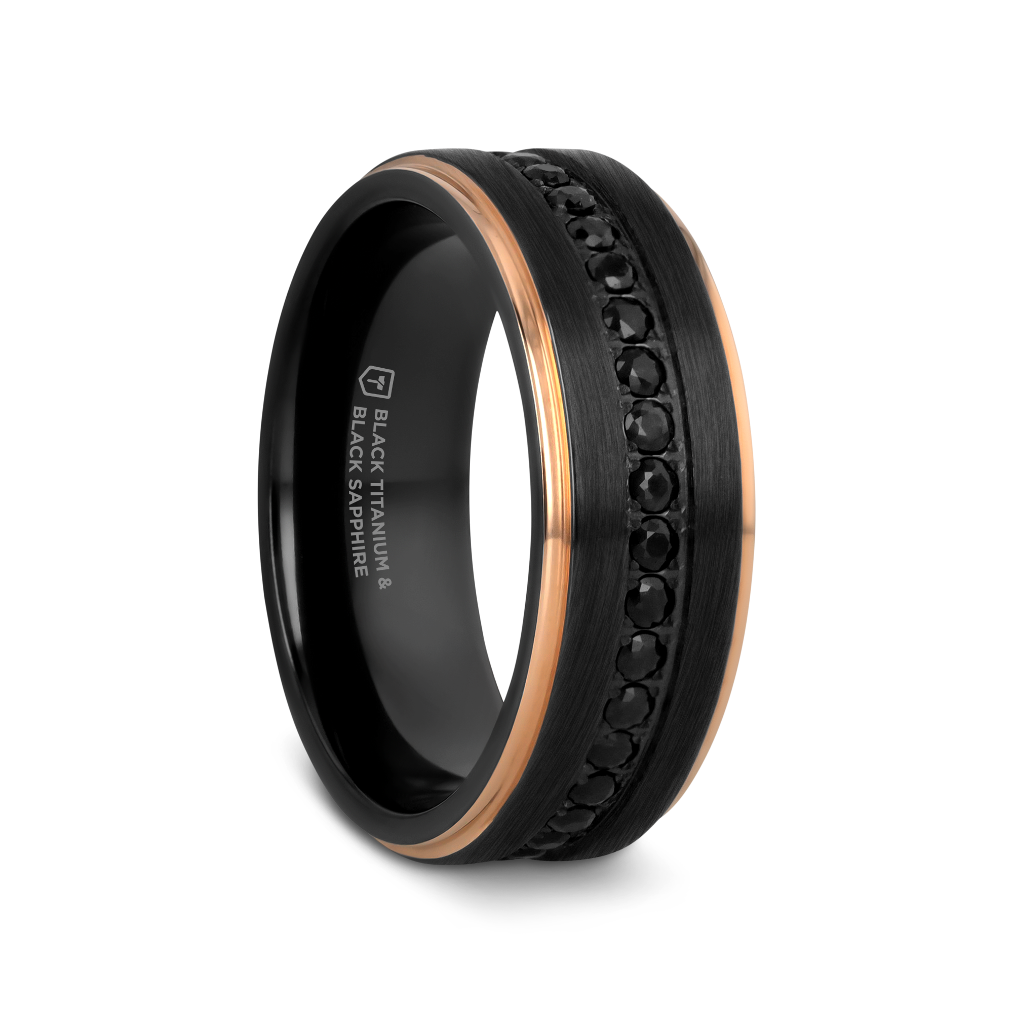 This contemporary and bold wedding band by Thorsten features an interior band of Black Titanium and a brushed finish outer band with a series of Black Sapphires all framed by Rose Gold bevels.