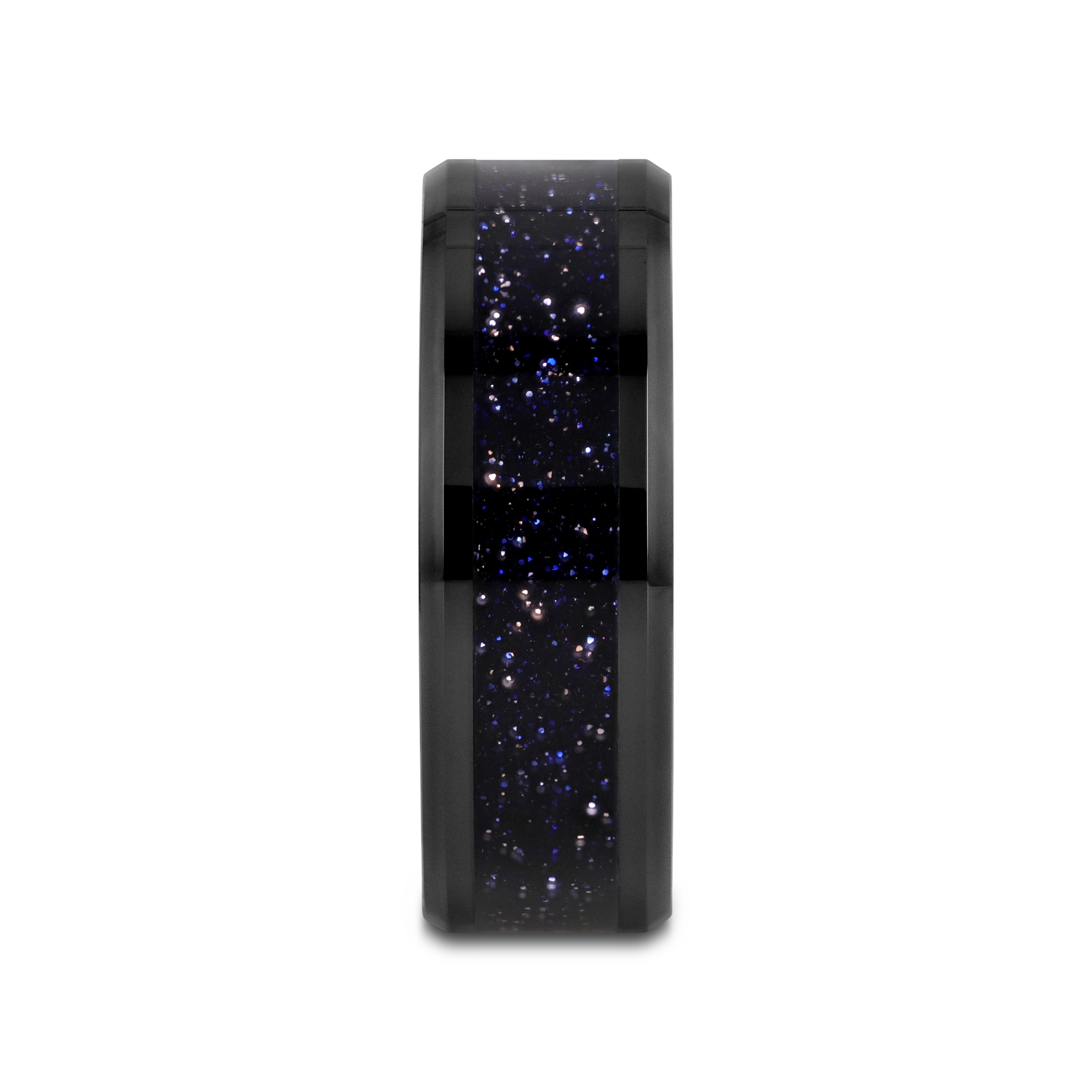 MELO Black Ceramic Beveled Polished Men’s Wedding Band with Synthetic Purple Goldstone Inlay - 8mm