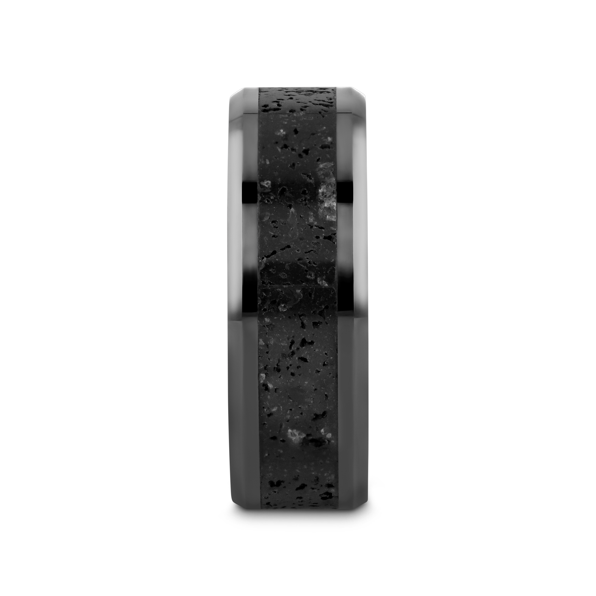 From the volcano to your finger. This stylish and handsome Ceramic wedding band has glossy, polished edges with bevels. It’s the inlay that takes center stage, however, with a mashup of black and gray Genuine Lava rock. It looks as if a channel of Genuine Lava once flowed through the band, only to harden, leaving it in its current state. The ring is available in 6mm and 8mm widths and several sizes.
